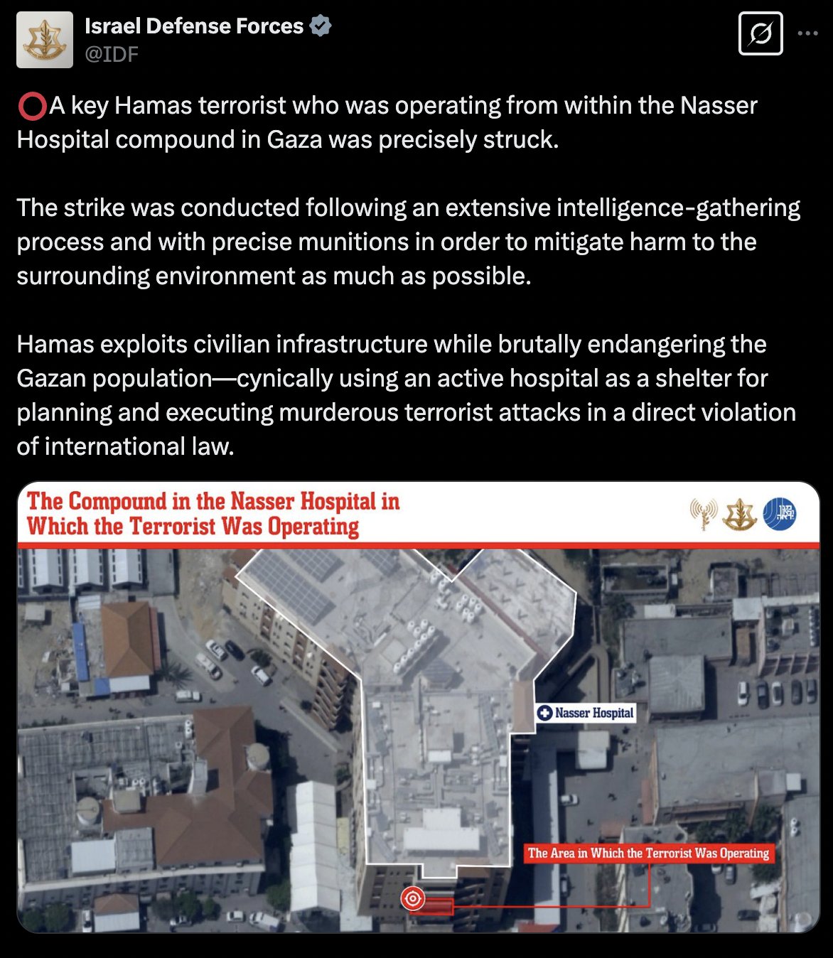 Around 9:10 pm, an Israeli airstrike directly struck Nasser Medical Complex in Khan Younis, the main hospital that remains functioning in southern Gaza.
