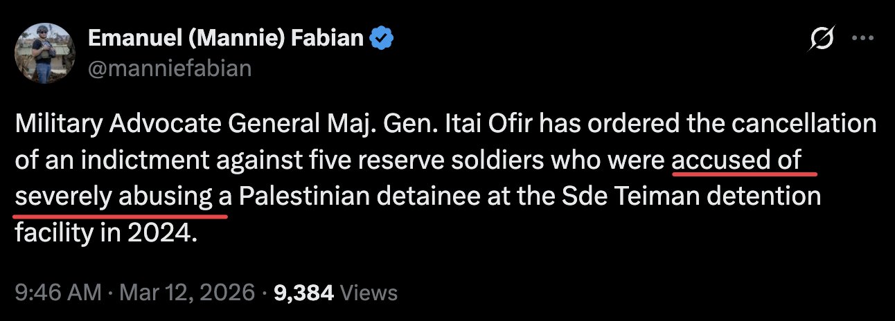 Israel's new Military AG announced that the (mock-)indictment of Force 100 reservists, who were caught on tape torturing and raping a Palestinian hostage at Sde Teiman Concentration Camp, had been officially dropped.