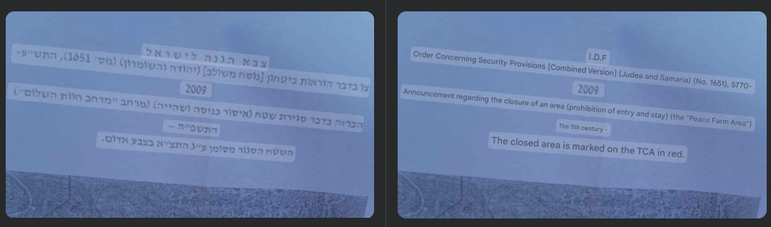 August 11, 2025 – After residents had already resigned themselves to displacement by settler militias and were preparing to leave their homes within the next couple of days, soldiers arrived in the village late at night. They declared the village a "closed military zone" and ordered the residents to leave immediately.