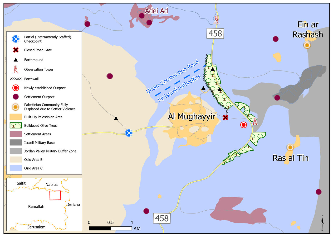 According to Dror Etkes (Kerem Navot): eight outposts now surround Al-Mughayyir, including Adei Ad (legalized 2022, recognized 2025).