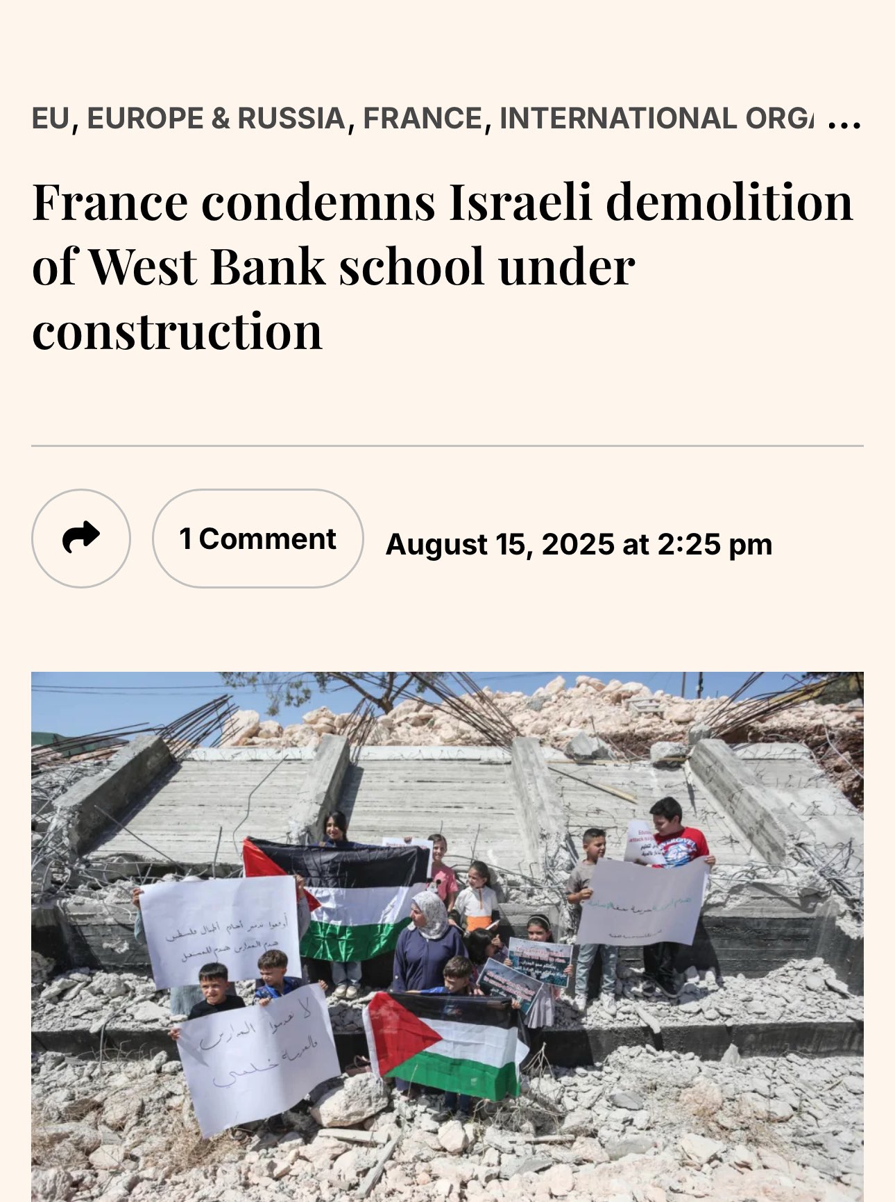 On Augustus 15, “France strongly condemns the destruction by Israeli authorities of a school under construction in the northern West Bank, funded by the French Development Agency in cooperation with the European Union. We are demanding accountability from the Israeli authorities for this demolition”