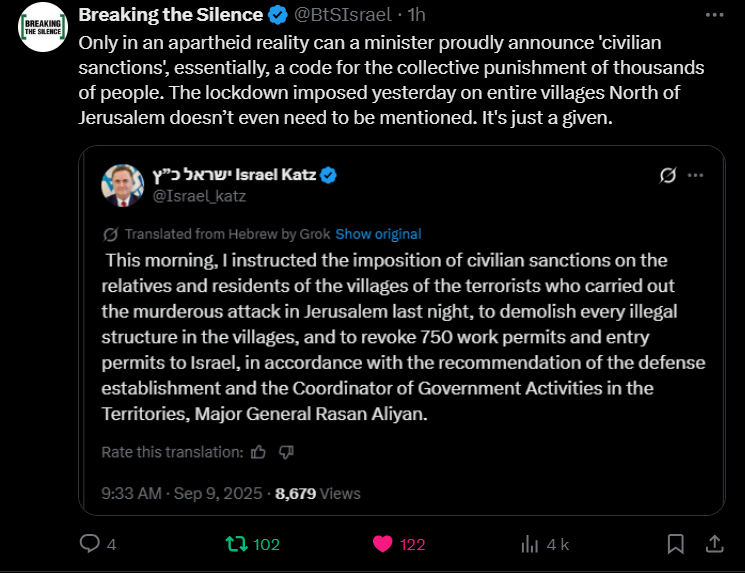On X, Israel Katz, Israel’s Minister of Defense, stated: “This morning I instructed that civil sanctions be imposed on the relatives and villagers of the terrorists who carried out last night’s murderous attack in Jerusalem, and to demolish every building in the villages that is not legal, as well as to revoke 750 work permits and entry permits to Israel. This is in accordance with the recommendation of the security establishment and the Coordinator of Government Activities in the Territories, Major General Ghassan Alian.”