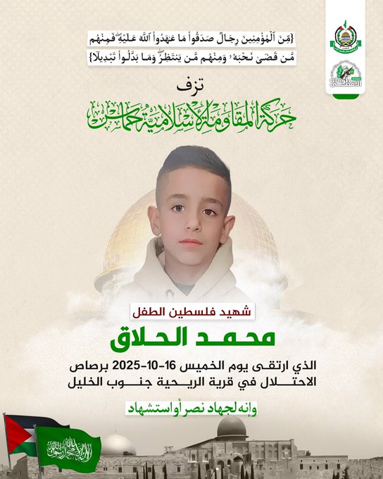 On October 16, 2025, an 9-year-old Palestinian child, Mohammad Bahjat Al-Hallaq, was pronounced dead on Thursday evening after succumbing to wounds sustained earlier in the day when Israeli occupation forces opened fire in the village of Al-Rihiya, south of Hebron.