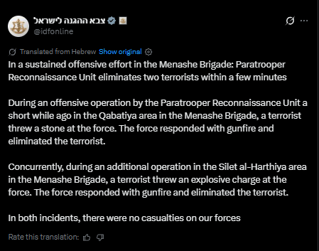 "In a continuous offensive effort in the Menashe Brigade: Paratroopers Reconnaissance Unit eliminates two terrorists within minutes. During offensive activity by the Paratroopers Reconnaissance Unit a short time ago in the Qabatiya area in the Menashe Brigade, a terrorist threw a brick at the force. The force responded with gunfire and eliminated the terrorist. In parallel, during another activity in the Silet al-Harithiya area in the Menashe Brigade, a terrorist threw an explosive charge at the force. The force responded with gunfire and eliminated the terrorist. In both incidents, there were no casualties among our forces."