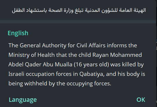 "On Saturday, 20 December 2025, Israeli forces raided the town of Qabatiya in the West Bank. Local youths responded by throwing stones at the armored jeeps. During the raid, and after the stone-throwing had ceased, a soldier shot 16 year old Rayan Abu M’ala. Eyewitnesses heard 3–5 shots fired from close range. The Israeli military claimed that the shooting was a response to Abu M’ala throwing a brick at the forces. However, footage from the scene refutes this claim. After the shooting, soldiers prevented a Palestinian ambulance from evacuating Abu M’ala, leaving him on the ground for about half an hour. He was later taken in a military jeep. His body has been held by Israel ever since. This is not an isolated case, but a direct result of a permissive open-fire policy in the West Bank. Since October 2023, Israel has killed 1,022 Palestinians in the West Bank, including 221 minors. Under Israel’s apartheid regime, Palestinian lives continue to be treated as expendable. Even when killings are carried out in front of cameras, and when it is clear they were committed in violation of the rules and the law, no one is held accountable. The international community has a duty to do everything in its power to stop Israel’s crimes."