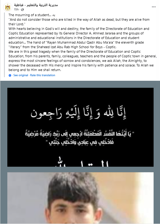 "With hearts full of faith in God’s decree and destiny, the family of the Qabatya Directorate of Education, represented by its Director General Mr. Ahmed Jarrara, and all the administrative and educational staff of the Directorate, mourn the martyred student Ryan Muhammad Abdel Qader Abu Ma’la, 11th grade “Literary” class, from Martyr Izzat Abu Rab Secondary School for Boys – Qabatya. In this great loss, the Qabatya Directorate of Education extends its deepest condolences to his parents, family, classmates, teachers, and the people of Qabatya in general, praying to Allah Almighty to grant the deceased His vast mercy, and to inspire his family with patience and solace. Truly, to Allah we belong and to Him we shall return."