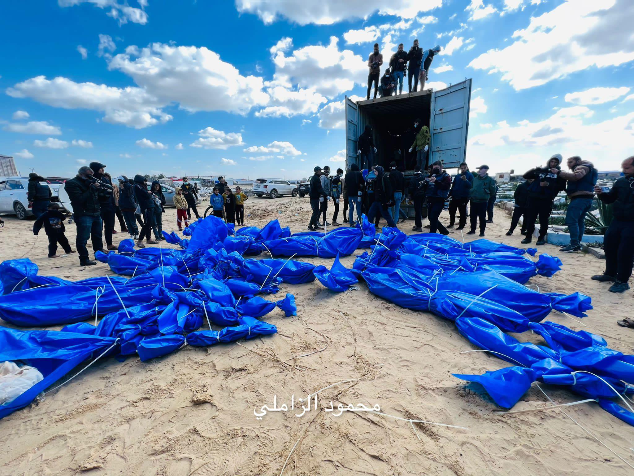 Israel has returned the bodies of 111 Palestinian civilians (Women, men and children) In Khan Younis, 111 bodies wrapped in bright blue bags, without any identities nor precise origin, arrived in a shipping container on the back of a truck. They were buried the same day in a mass grave in Khan Yunis.