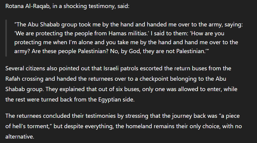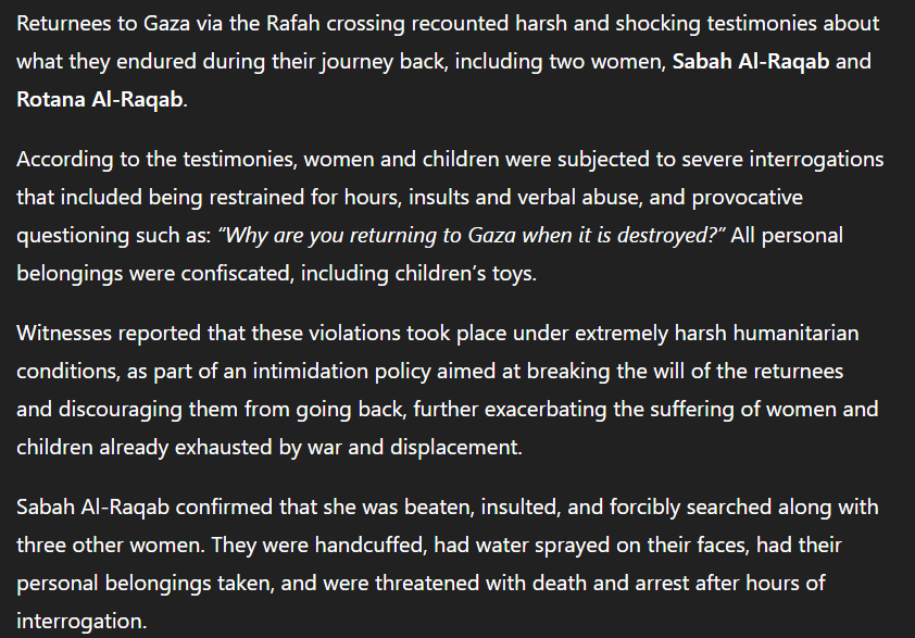 Testimonies of the returnees to Gaza On February 3, returnees to Gaza described severe abuse at the Rafah crossing, particularly against women and children, including prolonged detention, humiliation, harsh interrogations, and confiscation of personal belongings. Witnesses said the treatment aimed to intimidate returnees and deter them from going back to Gaza, worsening the suffering of those already affected by war and displacement. Two women, Sabah and Rotana Al-Raqab, testified to being beaten, restrained, threatened, and handed over to the Israeli army, with one accusing a local group of falsely claiming to protect civilians while cooperating with Israeli forces. Returnees also reported that most buses were turned back at the crossing, with only one allowed to enter Gaza. Despite describing the experience as *“a piece of hell’s torment,” *they emphasized that returning to their homeland remains their only choice.