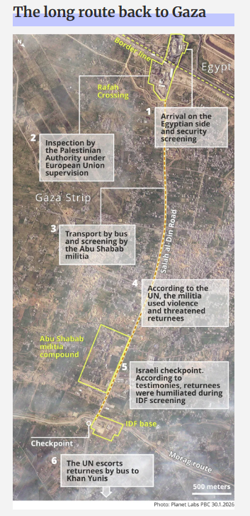 The Rafah crossing has reopened under EU supervision (EUBAM), but movement remains tightly controlled. Palestinians returning from Egypt face hours-long delays and cannot enter Gaza directly. Israel has established a military checkpoint — the “Regavim corridor” — outside the crossing, where Israeli security forces screen identities, verify intelligence-approved lists, and search belongings. Only after passing both Rafah and Israeli military screening are individuals permitted to enter the besieged enclave.