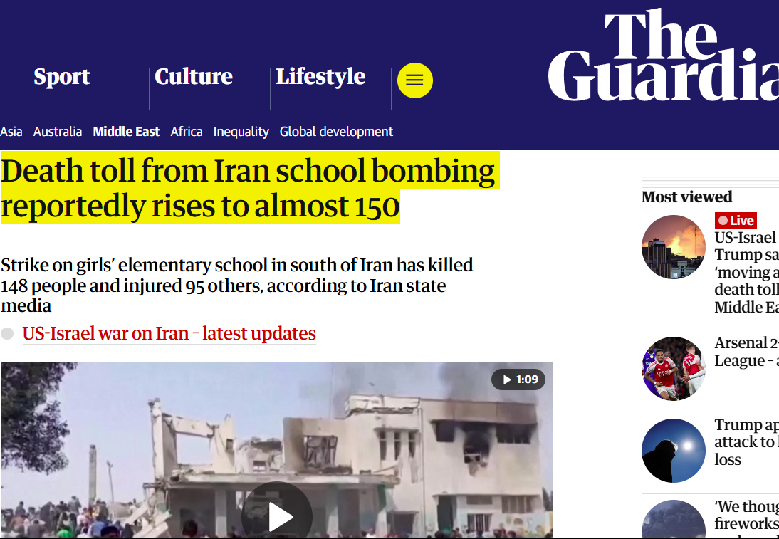 On March 1, The Guardian reports that the Israeli-Us "strike on girls’ elementary school in south of Iran has killed 148 people and injured 95 others, according to Iran state media"