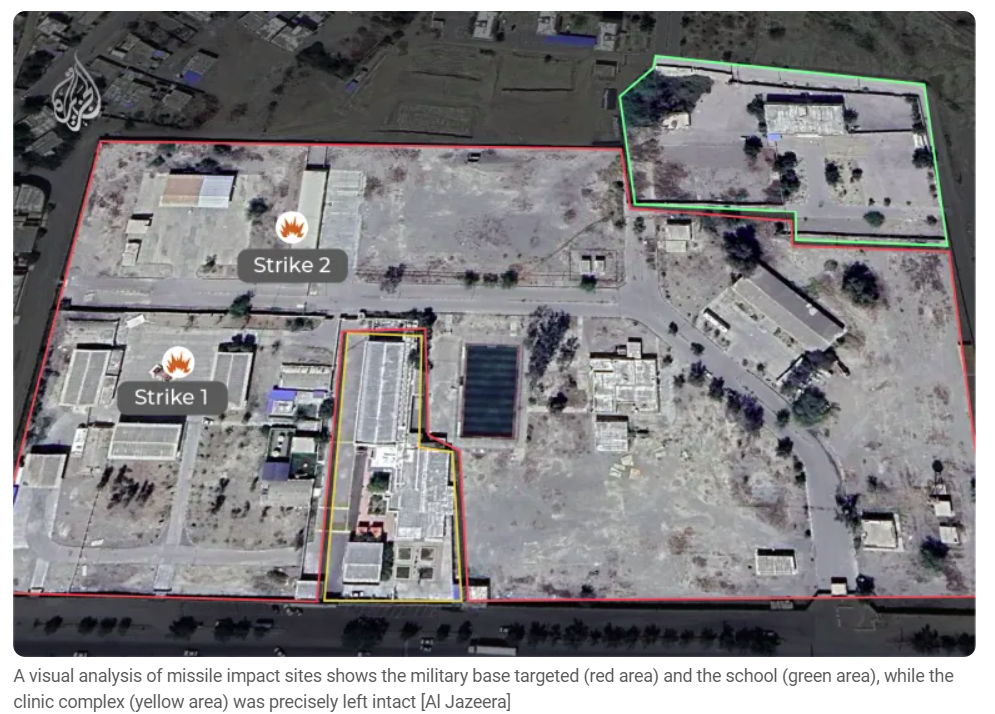 The attackers’ ability to spare newly established adjacent facilities (such as the Martyr Absalan clinic) and their glaring failure to avoid an elementary school operating at full capacity and packed with 170 girls leaves us with two scenarios, So, the evidence leaves two possible explanations, both unequivocally condemnatory: Either US and Israeli forces relied, in striking the vicinity of the Asif Brigade, on a very old, outdated intelligence target bank (dating to before 2013), which would constitute grave negligence and reckless disregard for civilian lives; or the strike was carried out deliberately and with prior knowledge to inflict maximum societal shock and undermine popular support for Iran’s military establishment.