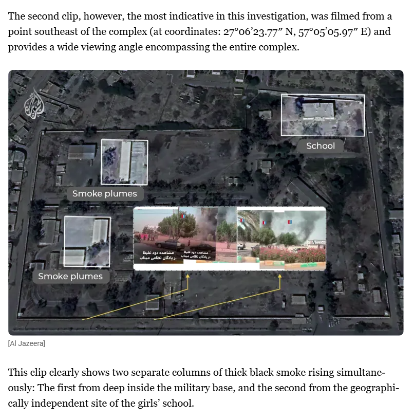 Key Investigation Findings : Satellite imagery and video analysis show the school was directly struck, not damaged accidentally and two separate missile impacts were identified: one on a nearby military base, another one on the school itself. This contradicts claims that damage came from debris or secondary explosions.