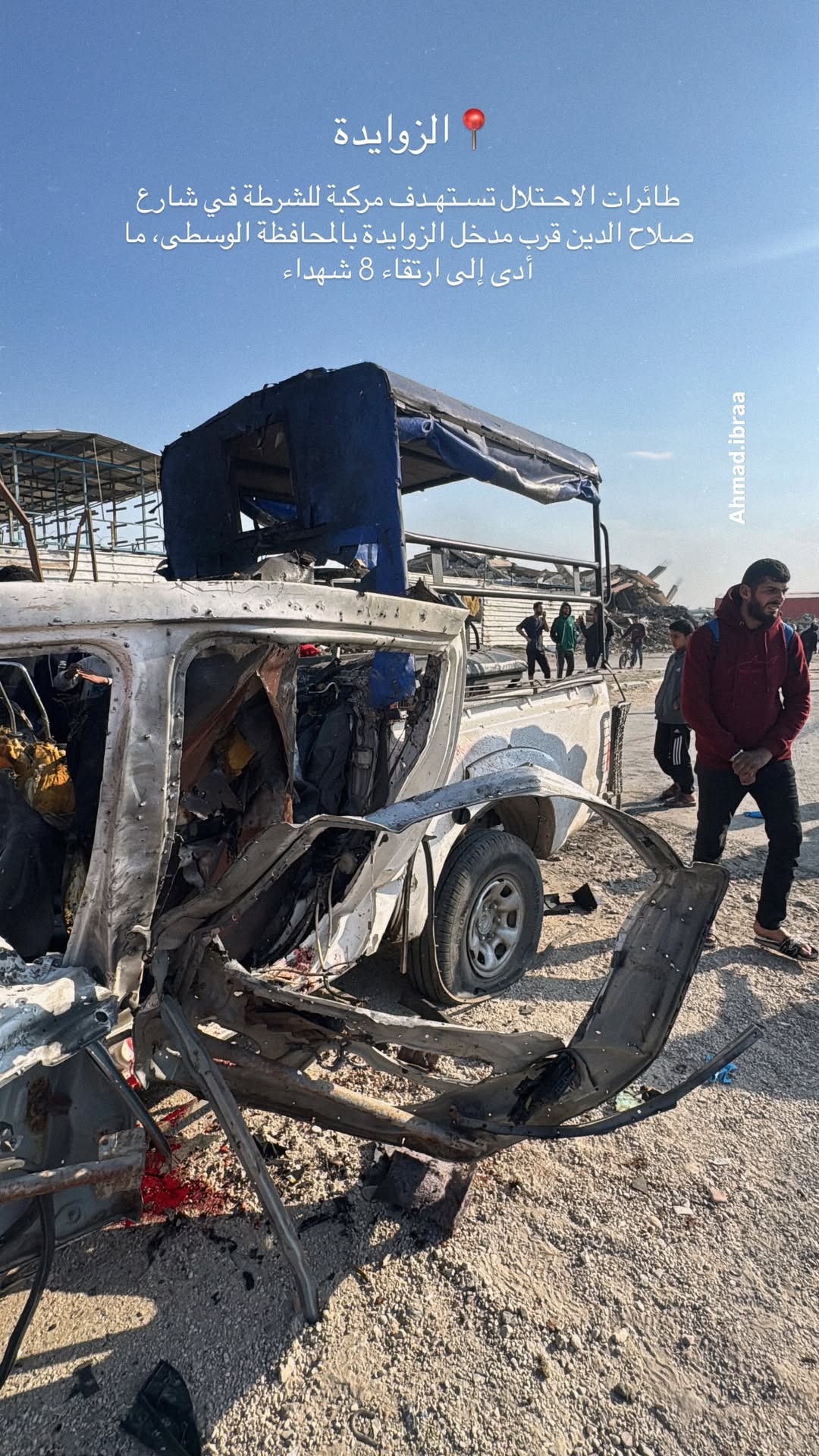 The first moments after an Israeli drone targeted a Palestinian police vehicle in the central governorate of the Gaza Strip, killing nine citizens